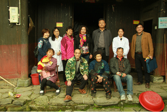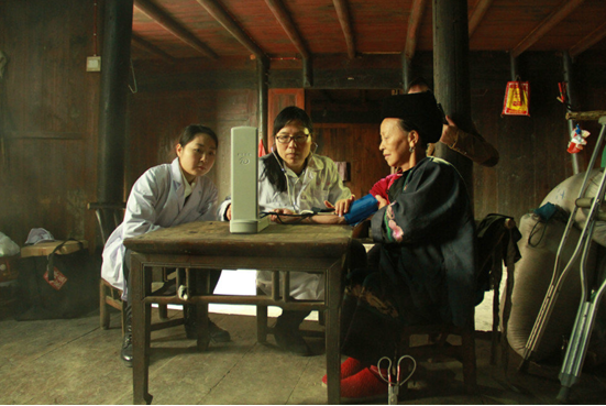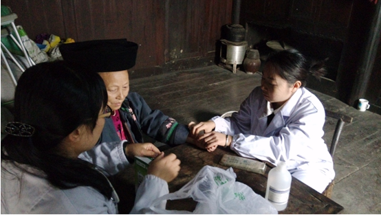 陈正英一行进村简短的休整后,在驻村工作队员的带领下,兵分两路,一队由陈书记带领医疗队老师对石照荣夫妇、石妹、龙八妹等7户村民进行检查治疗。