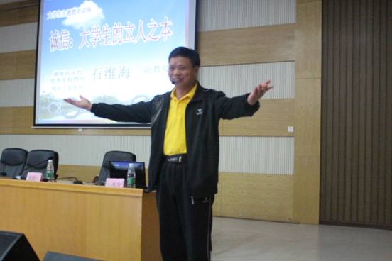 在主持人简短开场后,石教授开始了他的演讲。首先他以一曲美妙的歌曲缓缓拉开了此次演讲的序幕,营造了良好的现场气氛;然后,他用身边的现实经历和事迹向同学们讲述了诚信的历史意义和现代内涵,在赢得同学们热烈掌声的同时也将现场气氛推至高潮;紧接着他播放了“西安大学诚信摊点”、“2013年复旦大学投毒案”等视频,从正反两面解读了诚信的重要性。最后,石教授用一曲诙谐幽默的歌声结束了此次演讲。