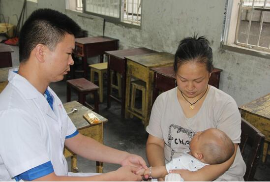 一部分义诊志愿者下乡走村入户进行义诊去了,李老师和另外几个义诊志愿者和支教志愿者在驻扎点河溪镇小学。李老师很早就开始了义诊活动的准备工作,晚上很晚才工作完休息,但他认为义诊时必须是精神万分的,这样才能达到最好的效果。老师前脚刚走去宿舍想休息一下,再继续工作,一位带着一个四个月大的孩子的阿姨就过来想体验老师的小儿推拿技术,我们打电话给老师,老师快速地赶了过来,疲惫的他,在工作时却精神昂扬。由于小孩子感冒,进行了一个多小时的小儿推拿。孩子的妈妈在临走前对老师表达了感激,老师说能得到群众的肯定,累一点都是值得的。
